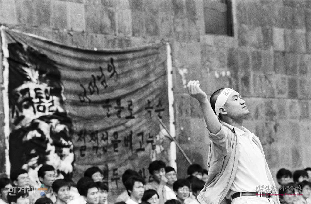 - 1988년 6월 9일 정부의 원천봉쇄 방침에 따른 강경대응에도 불구하고 6.10남북학생회담을 강행하기로 한 가운데 서울대 대학생들이 아크로폴리스광장에서 출정식을 하고 있다