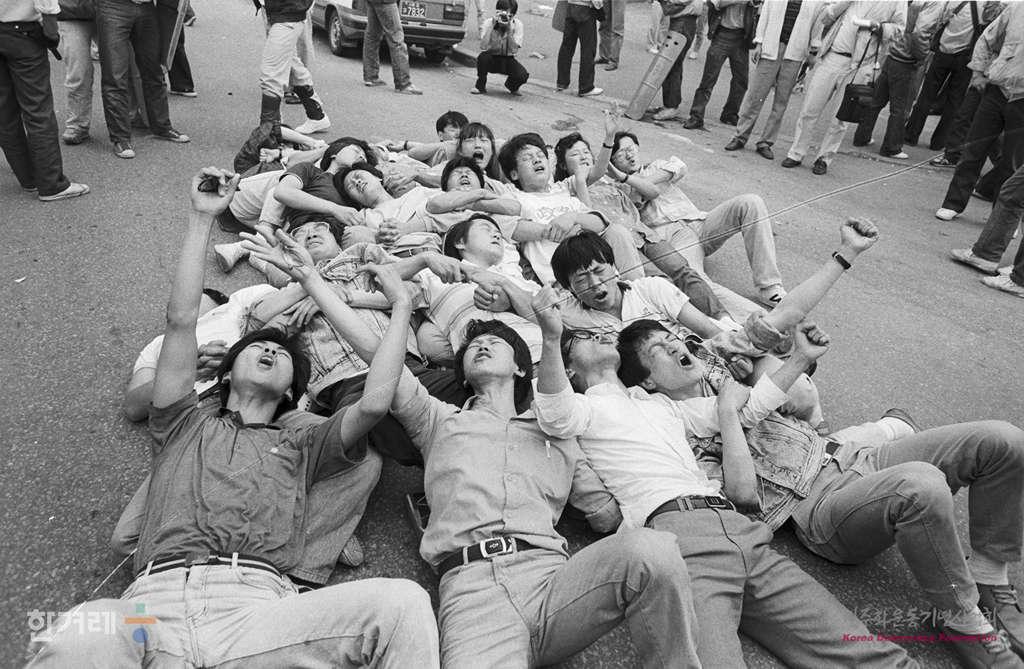 - 1988년 6월 9일 정부의 원천봉쇄 방침에 따른 강경대응에도 불구하고 6.10남북학생회담을 강행하기로 한 가운데 대학생들은 각 대학별로 출정식을 가진 뒤 연세대로 합류했다. 연세대로 들어가는 학생들의 수가 불어나기 시작한 오후 4시 30분 경찰은 연세대로 통하는 길목을 차단하자 도로를 점거하고 시위를 벌이다 일부 학생들이 경찰에 연행되고 있다.
