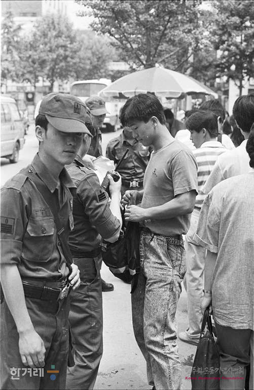 - 1988년 6월 9일 정부의 원천봉쇄 방침에 따른 강경대응에도 불구하고 6.10남북학생회담을 강행하기로 한 학생들은 각 대학별로 출정식을 가진 뒤 연세대로 합류했다. 연세대로 들어가는 학생들의 수가 불어나기 시작한 오후 4시 30분 경찰은 연세대로 통하는 길목을 차단하고 지나는 행인들을 검문검색을 하고 있다.