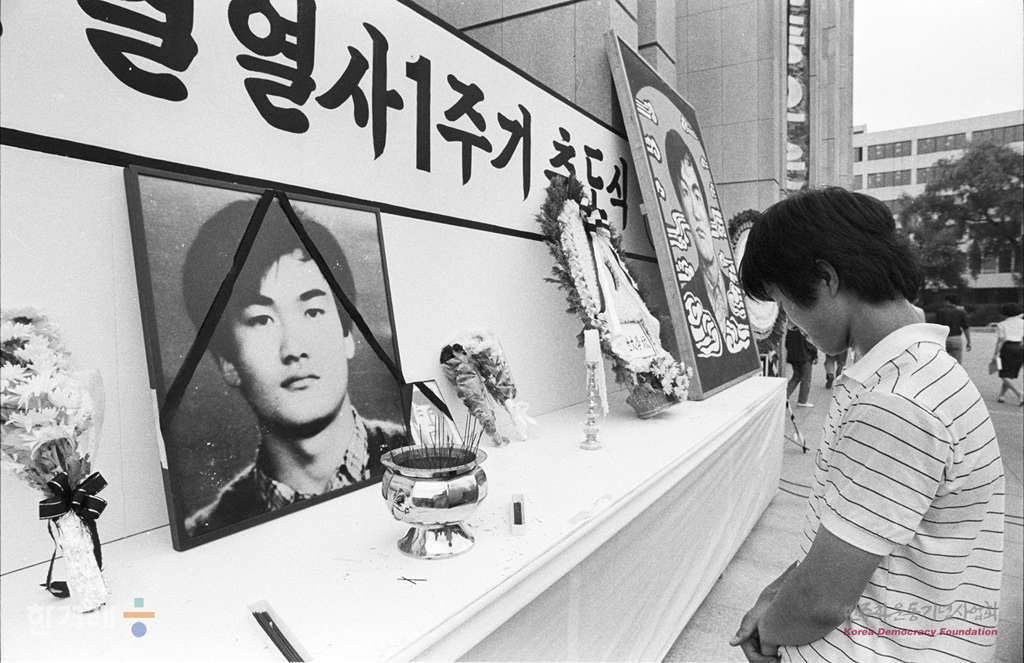 - 1988년 6월 9일 정부의 원천봉쇄 방침에 따른 강경대응에도 불구하고 6.10남북학생회담을 강행하기로 가운데 연세대 민주광장에서 경찰의 봉쇄를 뚫고 들어온 시민과 학생들이 고 이한열 열사 1주기 추모식을 하고 있다.