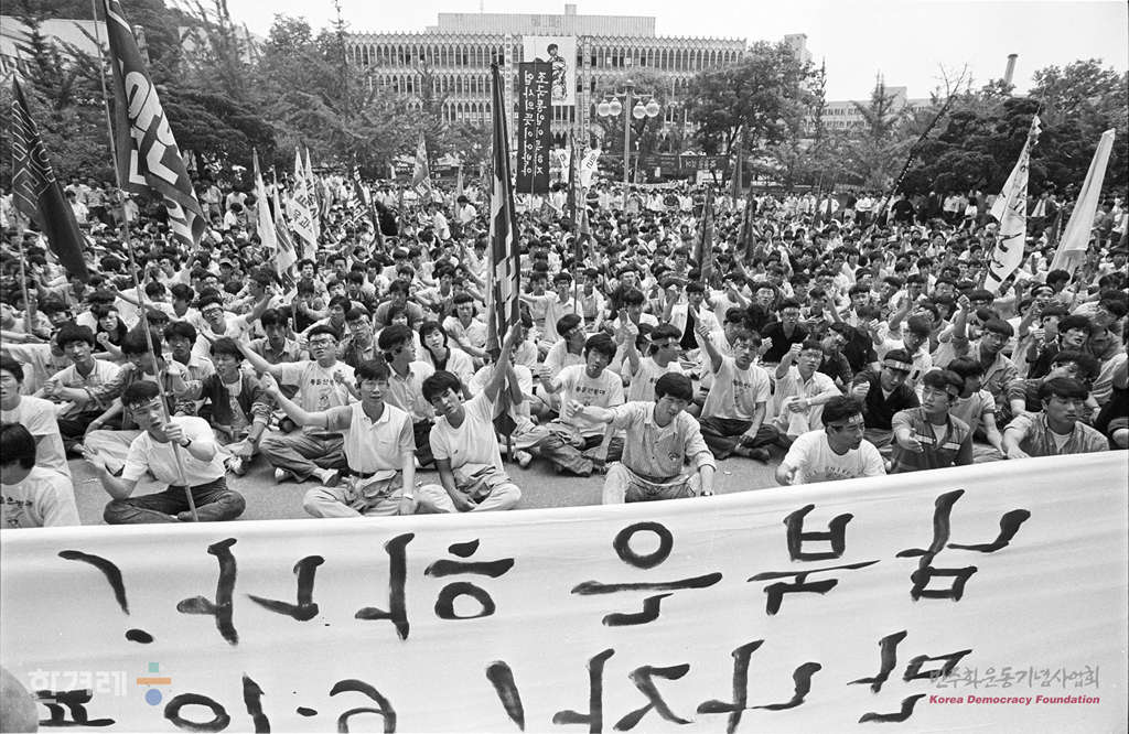 - 1988년 6월 9일 정부의 원천봉쇄 방침에 따른 강경대응에도 불구하고 6.10남북학생회담을 강행하기로 가운데 연세대 민주광장에서 경찰의 봉쇄를 뚫고 들어온 시민과 학생들이 고 이한열 열사 1주기 추모식을 하고 있다.