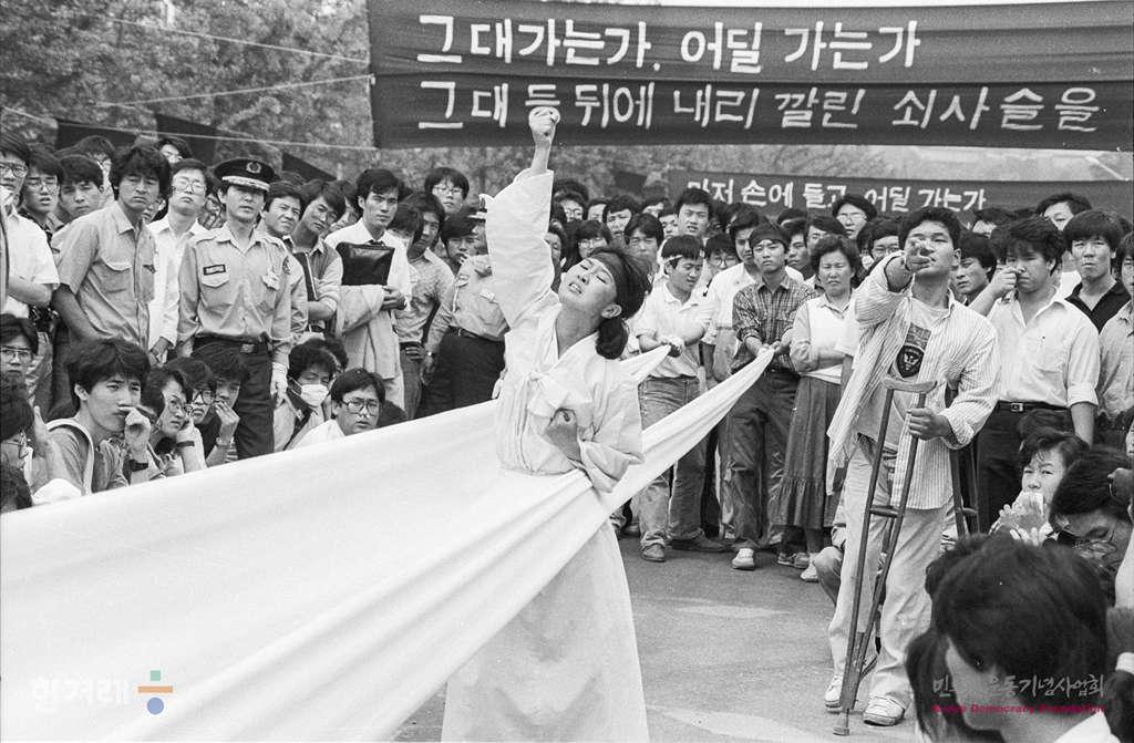 - 1988년 6월 9일 정부의 원천봉쇄 방침에 따른 강경대응에도 불구하고 6.10남북학생회담을 강행하기로 가운데 연세대 민주광장에서 경찰의 봉쇄를 뚫고 들어온 시민과 학생들이 고 이한열 열사 1주기 추모식을 하고 있다.