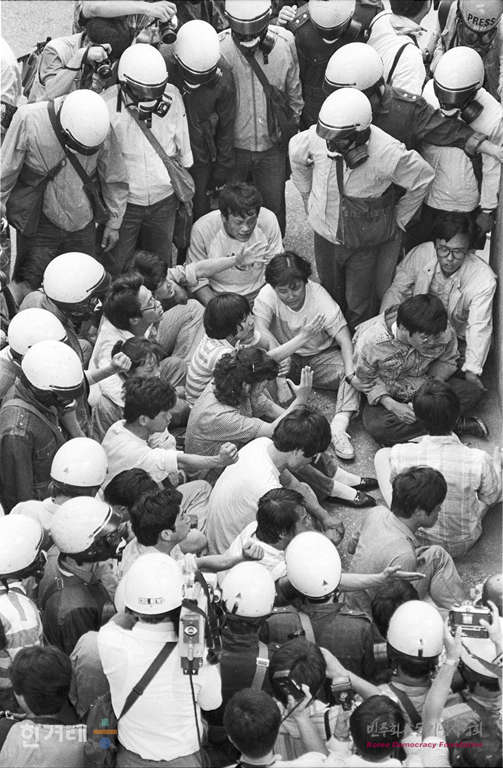 - 1988년 6월 9일 정부의 원천봉쇄 방침에 따른 강경대응에도 불구하고 6.10남북학생회담을 강행하기로 한 학생들은 각 대학별로 출정식을 가진 뒤 연세대로 합류했다. 연세대로 들어가는 학생들의 수가 불어나기 시작한 오후 4시 30분 경찰은 연세대로 통하는 길목을 차단하자 도로를 점거하고 시위를 벌이다 일부 학생들이 경찰에 연행되고 있다.