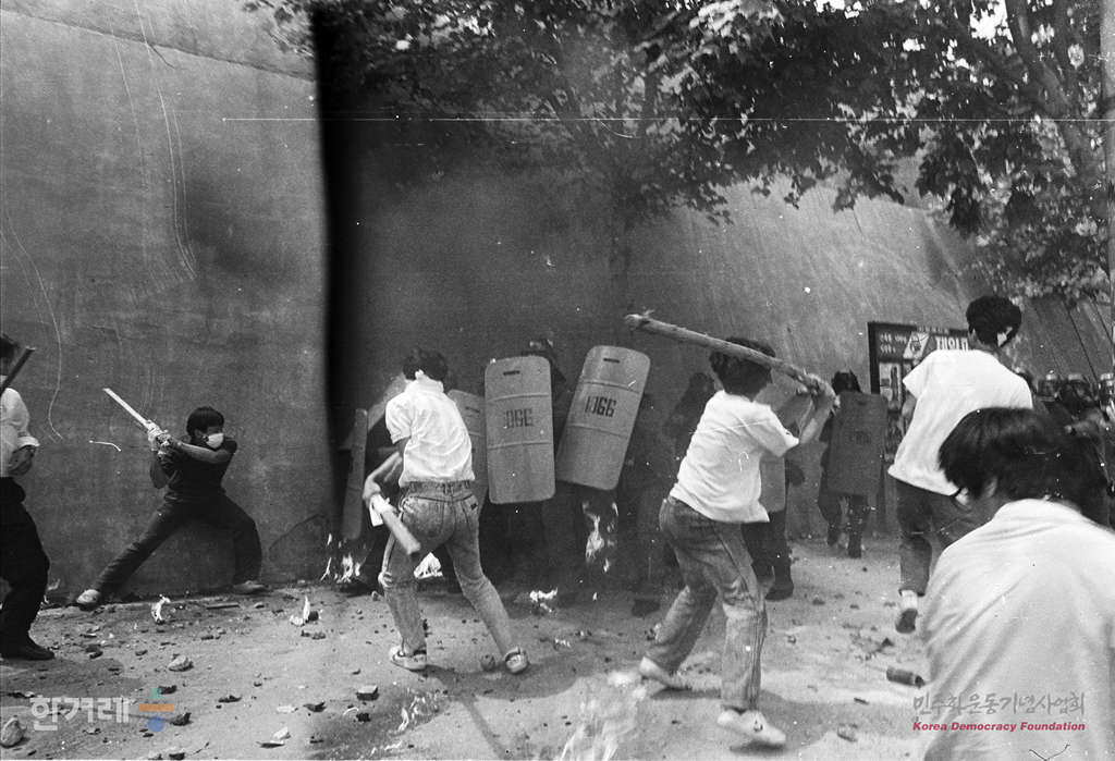 - 1988년 6월 10일 오전11시 전국25개 대학생 1만여명과 재야단체 회원, 평민당 문동환 부총재 등이 참석한 가운데 연세대 대운동장에서 6.10 민주화 투쟁 1주년 기념대회 및 백만학도 판문점 출정식을 마친 대학생들이 경찰이 교문진출을 저지하자 화염병과 각목을 격렬히 저항하고 있다.