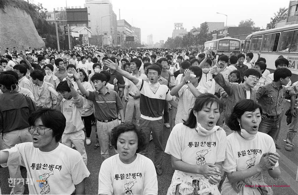 - 1988년 6월 10일 전국대학생 대표자협의회가 주도하는 6.10 남북 청년학생체육회담을 위한 학생들의 판문점행이 2만 6천여명의 경찰의 강력한 저지로 좌절된 가운데 연세대에 들어가지 못했던 학생들이 연세대 행진이 봉쇄되자 열차편으로 문산으로 갈 예정이었으나 경찰의 저지로 무산되자 서울역 인근에서 시위를 벌이고 있다.