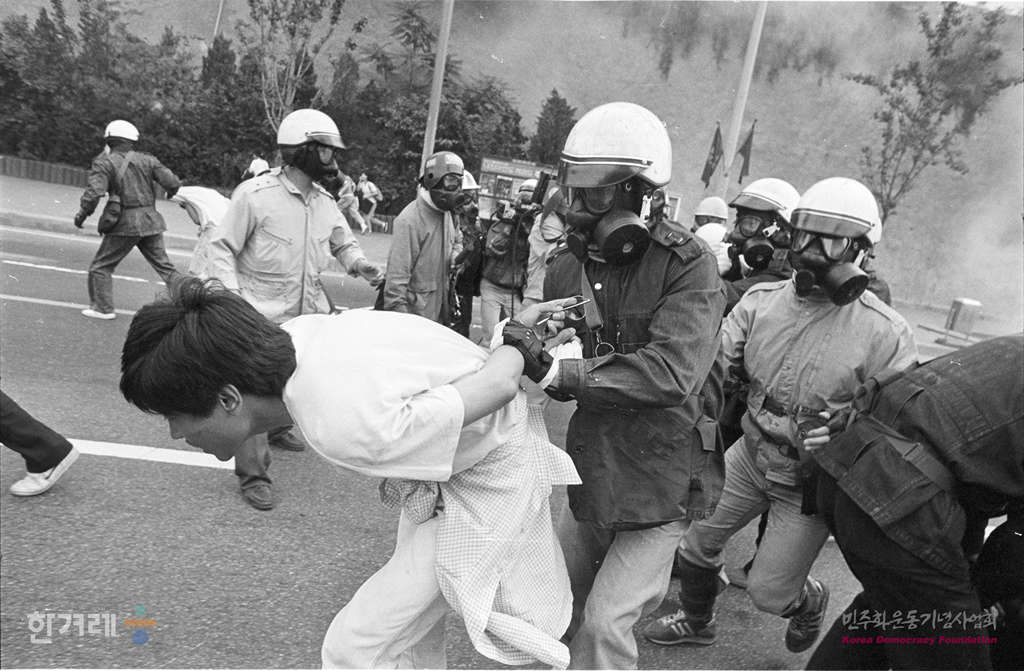 - 1988년 6월 10일 오전11시 전국25개 대학생 1만여명과 재야단체 회원, 평민당 문동환 부총재 등이 참석한 가운데 연세대 대운동장에서 6.10 민주화 투쟁 1주년 기념대회 및 백만학도 판문점 출정식을 마친 대학생들이 경찰이 교문진출을 저지하자 화염병과 각목을 격렬히 저항하다 경찰에 체포되어 연행되고 있다
