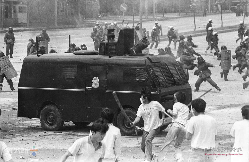 - 1988년 6월 10일 오전11시 전국25개 대학생 1만여명과 재야단체 회원, 평민당 문동환 부총재 등이 참석한 가운데 연세대 대운동장에서 6.10 민주화 투쟁 1주년 기념대회 및 백만학도 판문점 출정식을 마친 대학생들이 경찰이 교문진출을 저지하자 화염병과 각목을 격렬히 저항하고 있다.