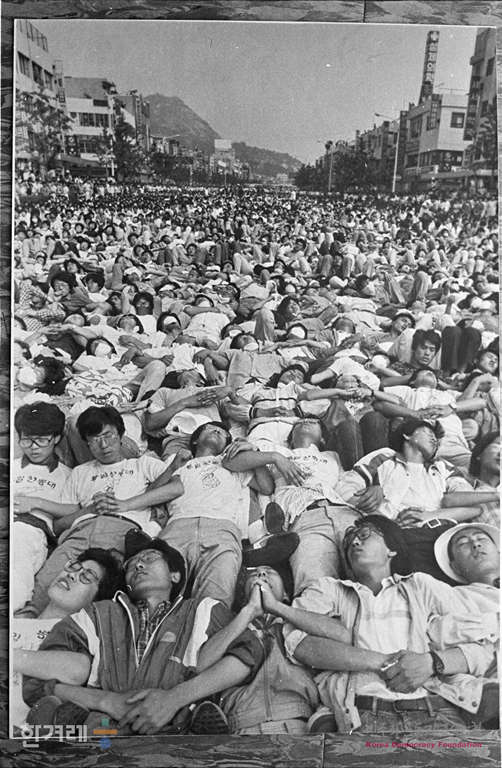 - 1988년 6월 10일 전국대학생 대표자협의회가 주도하는 6.10 남북 청년학생체육회담을 위한 학생들의 판문점행이 2만 6천여명의 경찰의 강력한 저지로 좌절된 가운데 연세대에 들어가지 못했던 학생들이 연세대 행진이 봉쇄되자 열차편으로 문산으로 갈 예정이었으나 경찰의 저지로 홍제동 네거리에서 판문점으로 도보행진을 벌이려다 경찰에 막히자 거리에 누워 시위를 벌이고 있다.