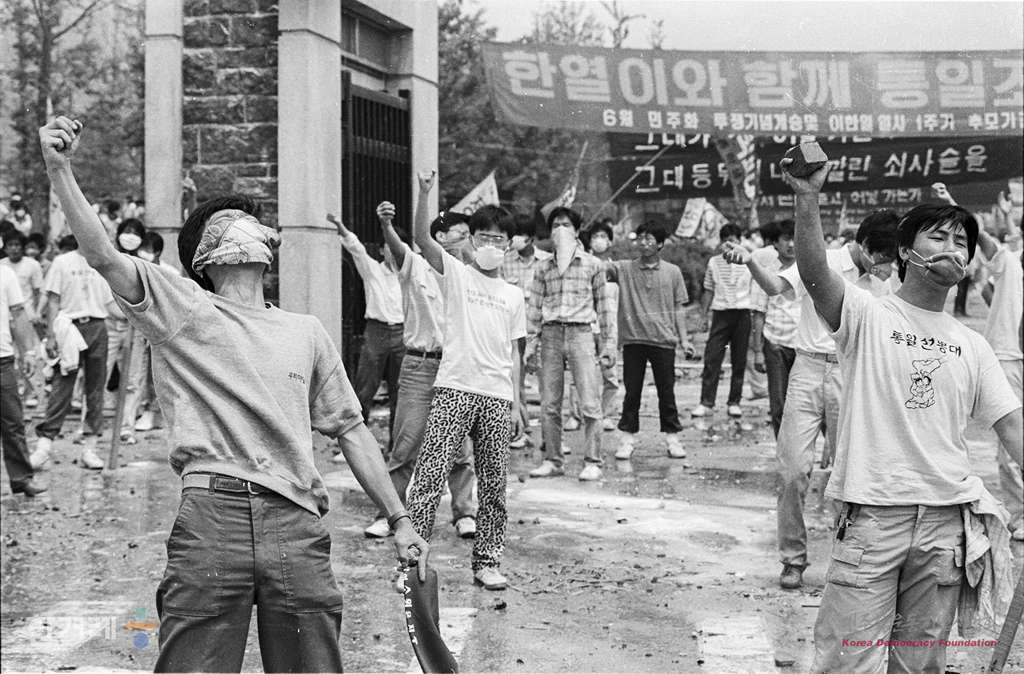 - 1988년 6월 10일 오전11시 전국25개 대학생 1만여명과 재야단체 회원, 평민당 문동환 부총재 등이 참석한 가운데 연세대 대운동장에서 6.10 민주화 투쟁 1주년 기념대회 및 백만학도 판문점 출정식을 마친 대학생들이 경찰이 교문진출을 저지하자 화염병과 각목을 격렬히 저항하고 있다.