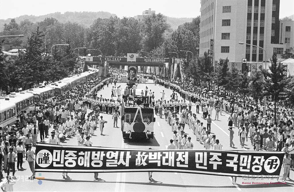 - 1988년 6월 12일 오후1시 ‘광주는 살아있다 끝까지 투쟁하라’등의 구호를 외치며 분, 6일 숨진 박래전씨의 장례식이 열린 경희궁 시민공원(옛 서울고 운동장)에서 유가족 재야인사 학생 시민 등 4천여명이 참석한 가운데 민주국민장이 마치고 거리행진을 하고 있다.