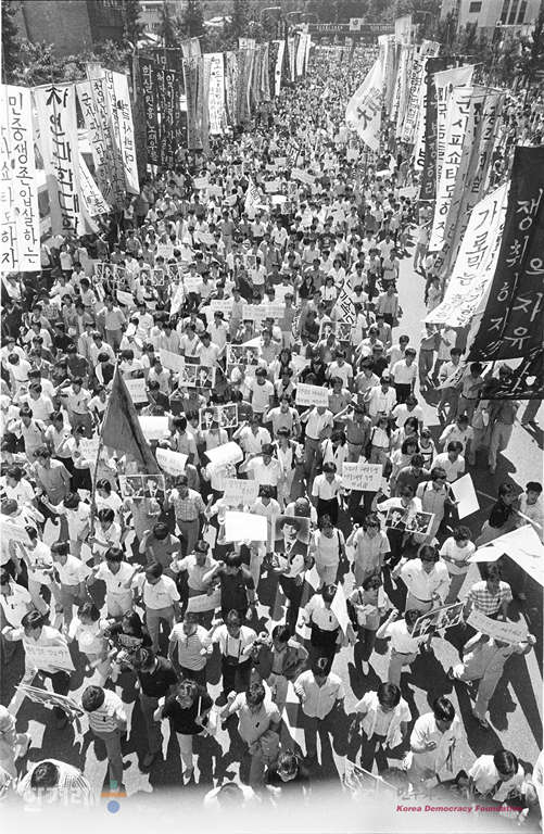 - 1988년 6월 12일 오후1시 ‘광주는 살아있다 끝까지 투쟁하라’등의 구호를 외치며 분, 6일 숨진 박래전씨의 장례식이 열린 경희궁 시민공원(옛 서울고 운동장)에서 유가족 재야인사 학생 시민 등 4천여명이 참석한 가운데 민주국민장이 마치고 거리행진을 하고 있다.