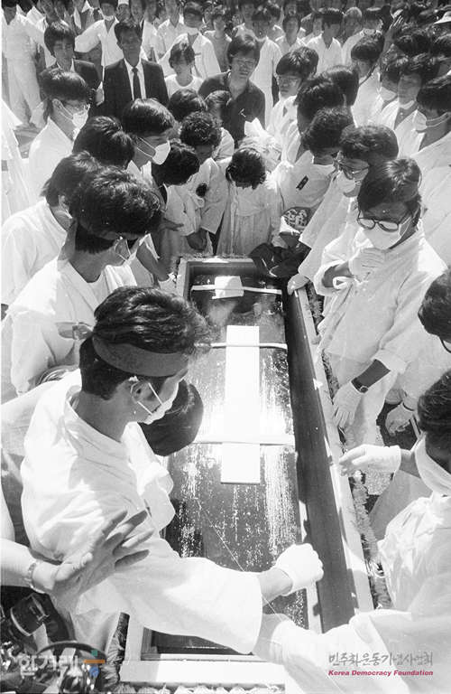- 1988년 6월 12일 오후1시 ‘광주는 살아있다 끝까지 투쟁하라’등의 구호를 외치며 분, 6일 숨진 박래전씨의 장례식이 열린 경희궁 시민공원(옛 서울고 운동장)에서 유가족 재야인사 학생 시민 등 4천여명이 참석한 가운데 민주국민장이 마치고 거리행진을 하고 있다.