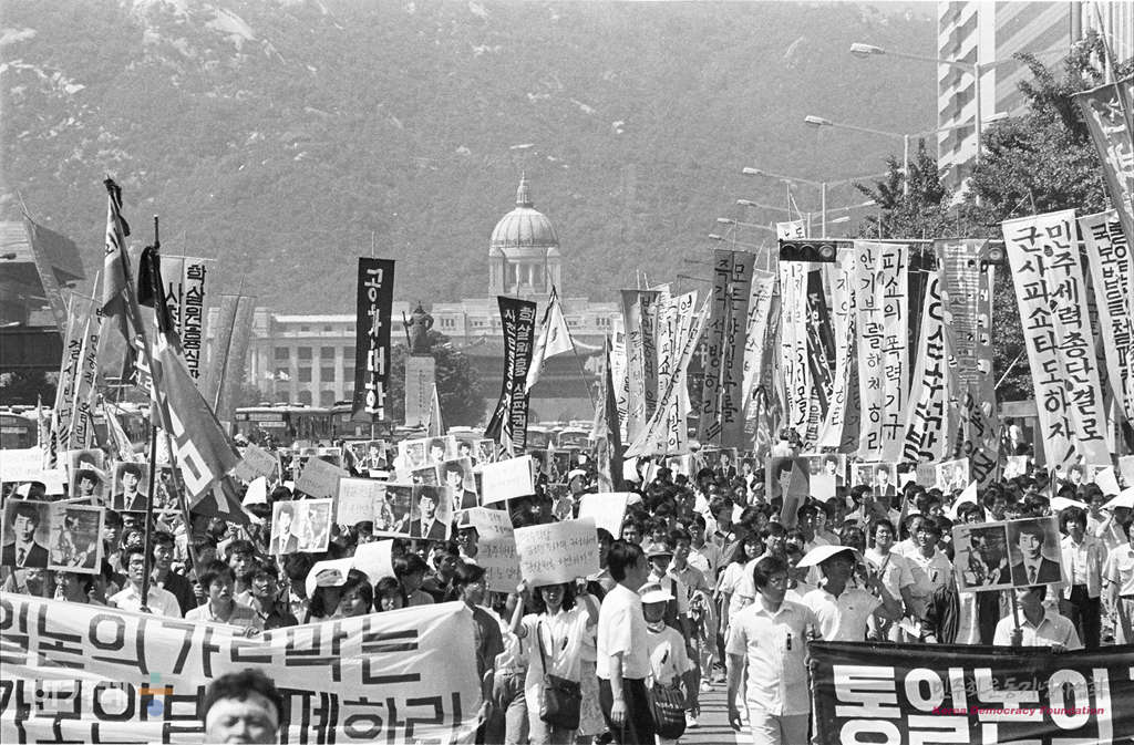 - 1988년 6월 12일 오후1시 ‘광주는 살아있다 끝까지 투쟁하라’등의 구호를 외치며 분, 6일 숨진 박래전씨의 장례식이 열린 경희궁 시민공원(옛 서울고 운동장)에서 유가족 재야인사 학생 시민 등 4천여명이 참석한 가운데 민주국민장이 마치고 거리행진을 하고 있다.