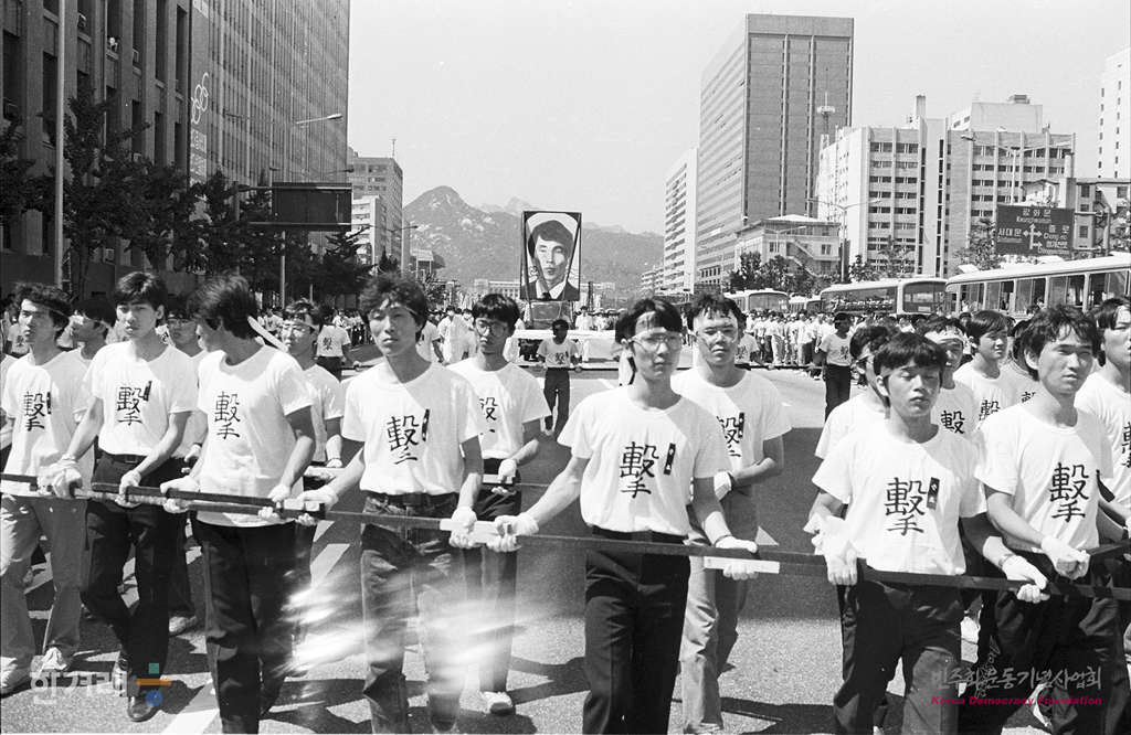 - 1988년 6월 12일 오후1시 ‘광주는 살아있다 끝까지 투쟁하라’등의 구호를 외치며 분, 6일 숨진 박래전씨의 장례식이 열린 경희궁 시민공원(옛 서울고 운동장)에서 유가족 재야인사 학생 시민 등 4천여명이 참석한 가운데 민주국민장이 마치고 거리행진을 하고 있다.