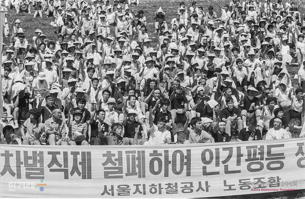 - 1988년 6월 12일 서노협 결성보고 및 노동악법 개정 촉구대회가 열린 연세대 노천극장에 참석한 서울지역 생산직 사무식노동자 2천여명은 파업기간중 노조원에게는 임금 지급 않는다는 노동부 지침 철회를 요구하고 있다.