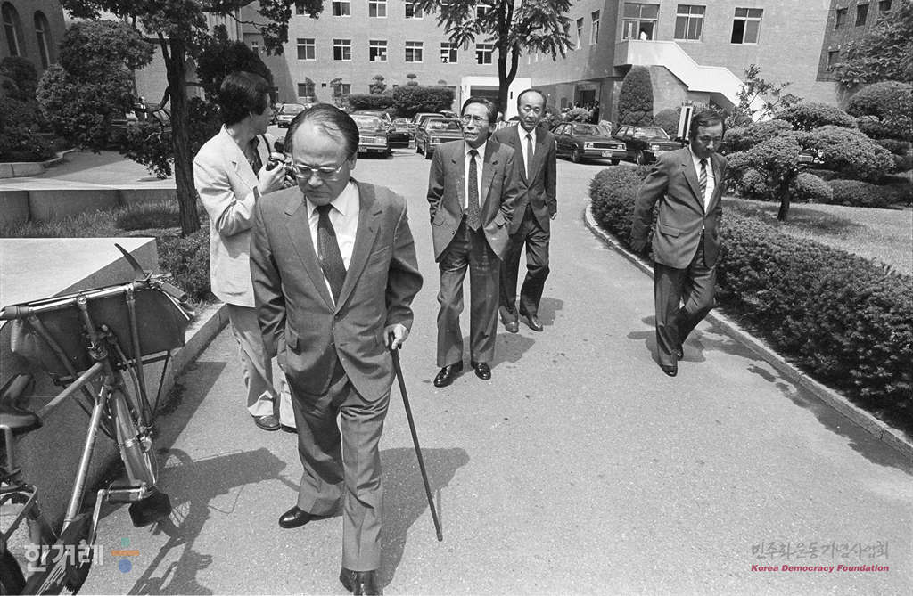 - 1988년 6월 16일 사법부 개혁을 요구하는 법관들의 성명이 계속되는 가운데 각계에서 지지표명과 함게 이를 계기로 대법원의 전면개편을 비롯해 사법부 정풍운동으로 승화돼야 한다는 기류가 흐르면서 각급 버원장들이 모여 법치행정처에서 긴급회의를 마치고 있다. 왼쪽부터 김용준 서울 가정법원장, 황도연 대전지법원장, 윤상목 제주지법원장, 심의섭 가광주지법원장.
