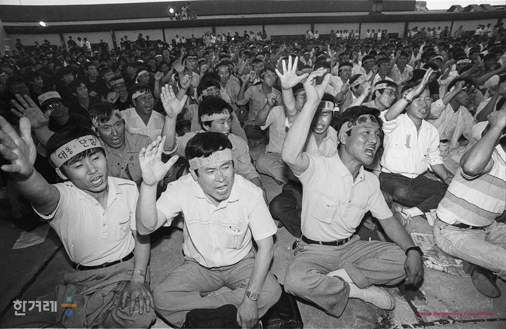 - 1988년 6월 16일 서울지하철공사 노조원들의 파업이 계속되는 가운데 노조원 2천여명이 군자 기지내 공작창 옥상에서 직제개편을 요구하며 농성을 벌이고 있다.