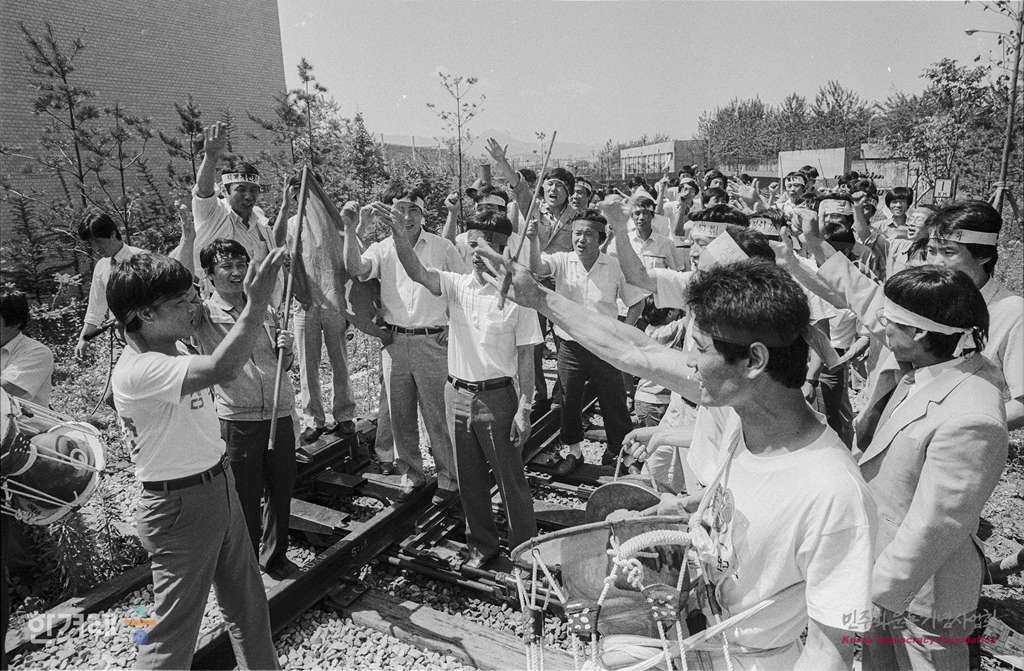 - 1988년 6월 16일 서울지하철공사 노조원들의 파업이 계속되는 가운데 노조원 2천여명이 군자 기지에서 직제개편을 요구하며 농성을 벌이고 있다.
