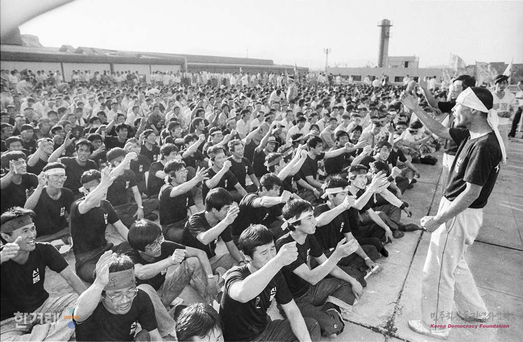 - 1988년 6월 16일 서울지하철공사 노조원들의 파업이 계속되는 가운데 노조원 2천여명이 군자 기지에서 직제개편을 요구하며 농성을 벌이고 있다.