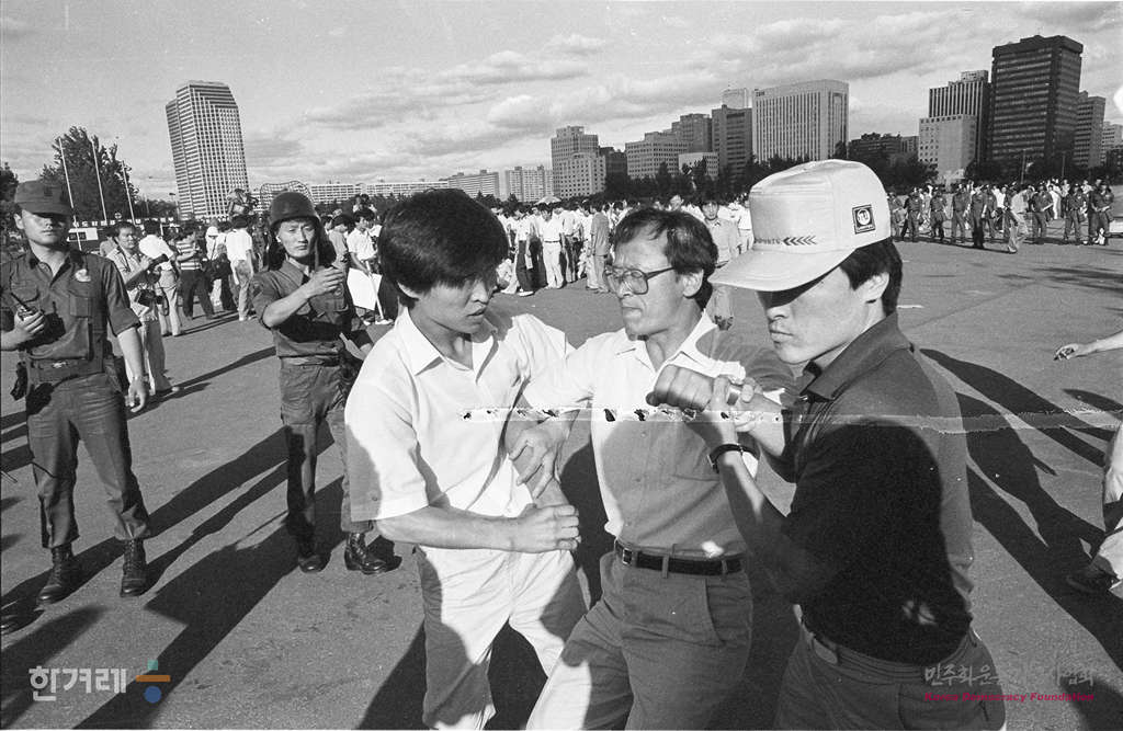 - 1988년 6월 24일 재야인사 학생등 1백50여명이 국회의사당 앞길에서 광주학살 진상규명 국정조사권 발동을 요구하며 연좌농성을 벌이다 경찰에 연행되고 있다.