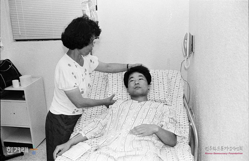 - 1988년 6월 28일 전경의 희롱과 폭언에 항의하다 전경 20여명으로부터 집단폭행을 당한 김정환씨가 척추 횡돌기 골절상을 입고 입원해 어머니 김혜자씨의 간호를 받고 있다.