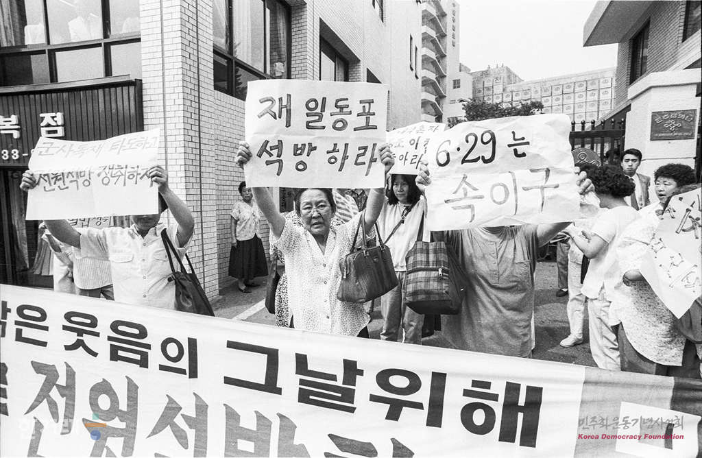- 1988년 6월 29일 민가협 회원 60여명이 윤길중 민정당 대표위원와 양심수 석방문제를 협의하기 위해 서울 민정당사로 들어가다 경찰의 저지를 받자 당사 정문앞에서 양심수 전원석방으로 요구하며 시위를 벌이고 있다.