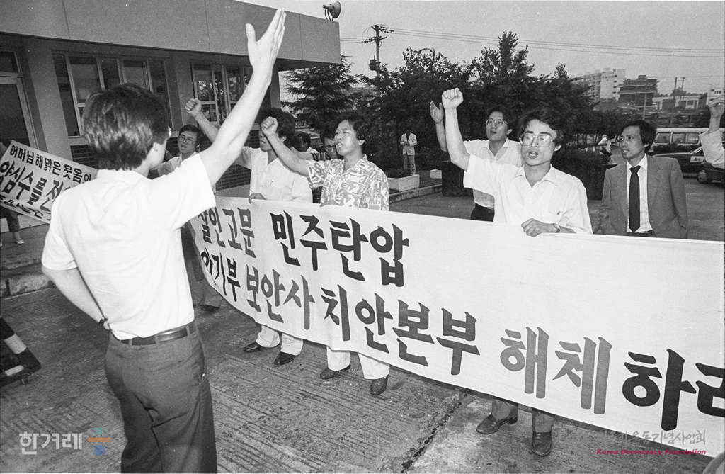 - 1988년 6월 30일 오전 9시 55분 구속된지 3년만에 가석방된 전 민주화운동청년연합 의장 김근태씨가 경북 김천교도소 정문을 나오마자마 부인 인재근씨와 함께 양심수 전원석방을 외치고 있다.