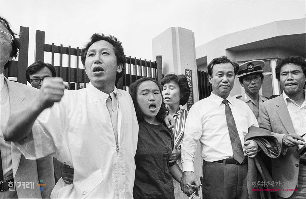 - 1988년 6월 30일 오전 9시 55분 구속된지 3년만에 가석방된 전 민주화운동청년연합 의장 김근태씨가 경북 김천교도소 정문을 나오마자마 부인 인재근씨와 함께 양심수 전원석방을 외치고 있다.