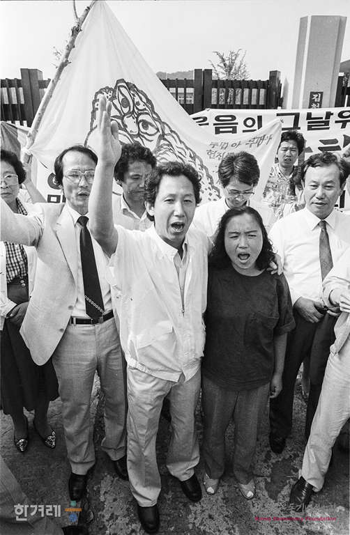 - 1988년 6월 30일 오전 9시 55분 구속된지 3년만에 가석방된 전 민주화운동청년연합 의장 김근태씨가 경북 김천교도소 정문을 나오마자마 부인 인재근씨와 함께 양심수 전원석방을 외치고 있다.