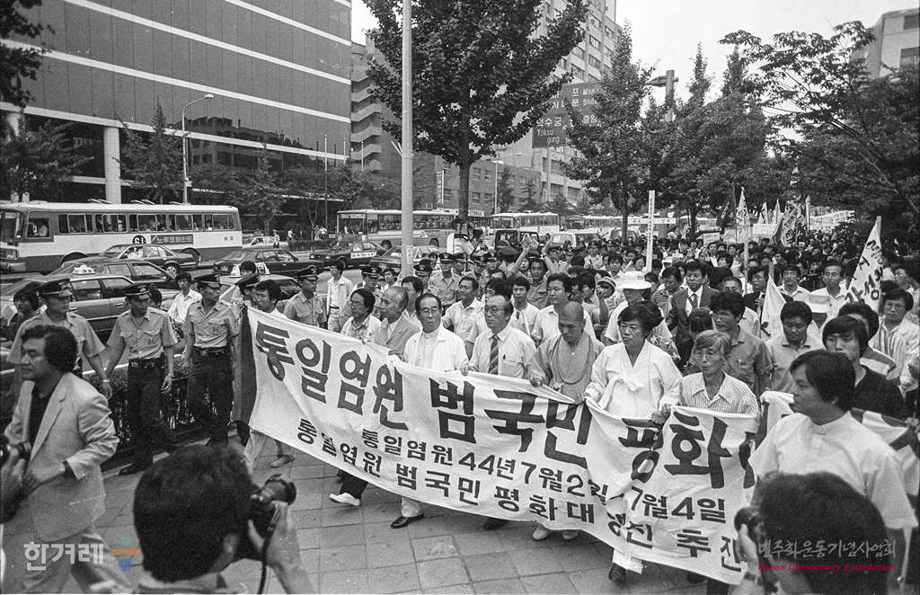 - 1988년 7월 4일. 통일염원 범국민 평화대행진 샛째날 서울 종로구 신문로 경희궁 시민공원에서 개회식을 하고 있다. 이날 참가들은 남북교류 민족화해를 외치며 종로를 거쳐 대학로까지 인도로 행진을 벌이고 있다.