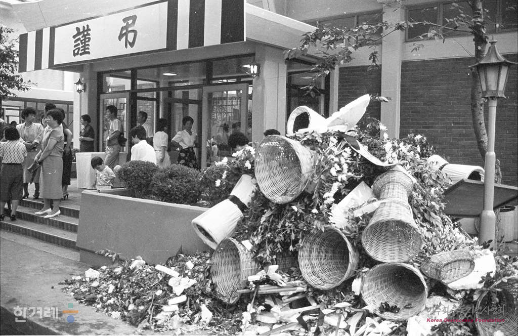 - 1988년 7월 8일 지난 1일 이라크 공군기의 공습으로 이란 캉간의 대림산업 가스정유소 정제공장 건설현장에 나가 있는 한국 노동자 10여명이 사망하고 40여명이 부상하는 사건이 발생했다. 분향소가 마련된 서울대병원 장례식장에 입구에 정부와 대림산업에서 온 조화가 내팽겨쳐져 있다.