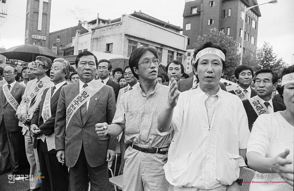 - 1988년 7월 12일 민가협, 민통련, 서민투련 등 재야단체와 평민당 민주당이 함께 서울 동숭동 대학로에서 김대중 김영삼 야 2당 촐재를 비롯한 학생 시민들과 각 당원들이 참석한 가운데 ‘양심수 전원석방 및 수배해제 쟁취를 위한 범국민대회’를 열고 있다. 이날 대회를 마친 참가자들은 검찰청사까지 평화대행진을 했다.