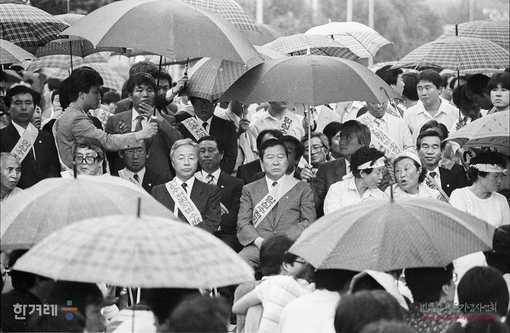 - 1988년 7월 12일 민가협, 민통련, 서민투련 등 재야단체와 평민당 민주당이 함께 서울 동숭동 대학로에서 김대중 김영삼 야 2당 촐재를 비롯한 학생 시민들과 각 당원들이 참석한 가운데 ‘양심수 전원석방 및 수배해제 쟁취를 위한 범국민대회’를 열고 있다. 이날 대회를 마친 참가자들은 검찰청사까지 평화대행진을 했다.