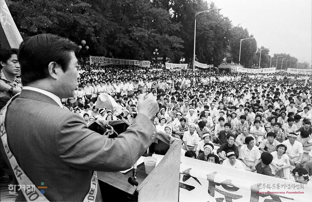 - 1988년 7월 12일 민가협, 민통련, 서민투련 등 재야단체와 평민당 민주당이 함께 서울 동숭동 대학로에서 김대중 김영삼 야 2당 촐재를 비롯한 학생 시민들과 각 당원들이 참석한 가운데 ‘양심수 전원석방 및 수배해제 쟁취를 위한 범국민대회’를 열고 있다. 이날 대회를 마친 참가자들은 검찰청사까지 평화대행진을 했다.