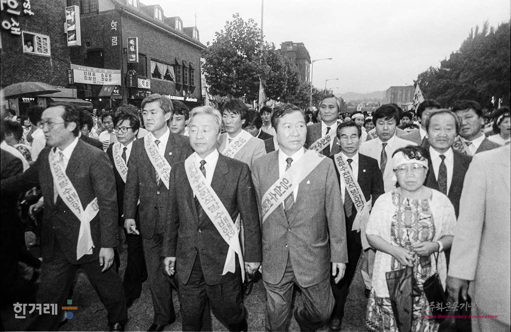 - 1988년 7월 12일 민가협, 민통련, 서민투련 등 재야단체와 평민당 민주당이 함께 서울 동숭동 대학로에서 김대중 김영삼 야 2당 촐재를 비롯한 학생 시민들과 각 당원들이 참석한 가운데 ‘양심수 전원석방 및 수배해제 쟁취를 위한 범국민대회’를 열고 있다. 이날 대회를 마친 참가자들은 검찰청사까지 평화대행진을 했다.