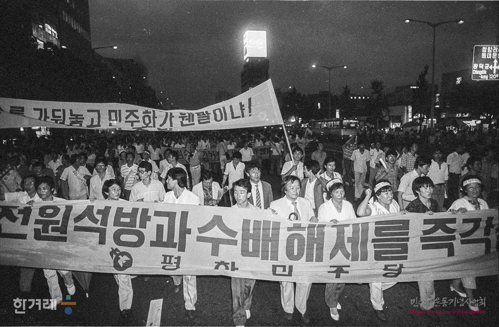 - 1988년 7월 12일 민가협, 민통련, 서민투련 등 재야단체와 평민당 민주당이 함께 서울 동숭동 대학로에서 김대중 김영삼 야 2당 촐재를 비롯한 학생 시민들과 각 당원들이 참석한 가운데 ‘양심수 전원석방 및 수배해제 쟁취를 위한 범국민대회’를 열고 있다. 이날 대회를 마친 참가자들은 검찰청사까지 평화대행진을 했다.