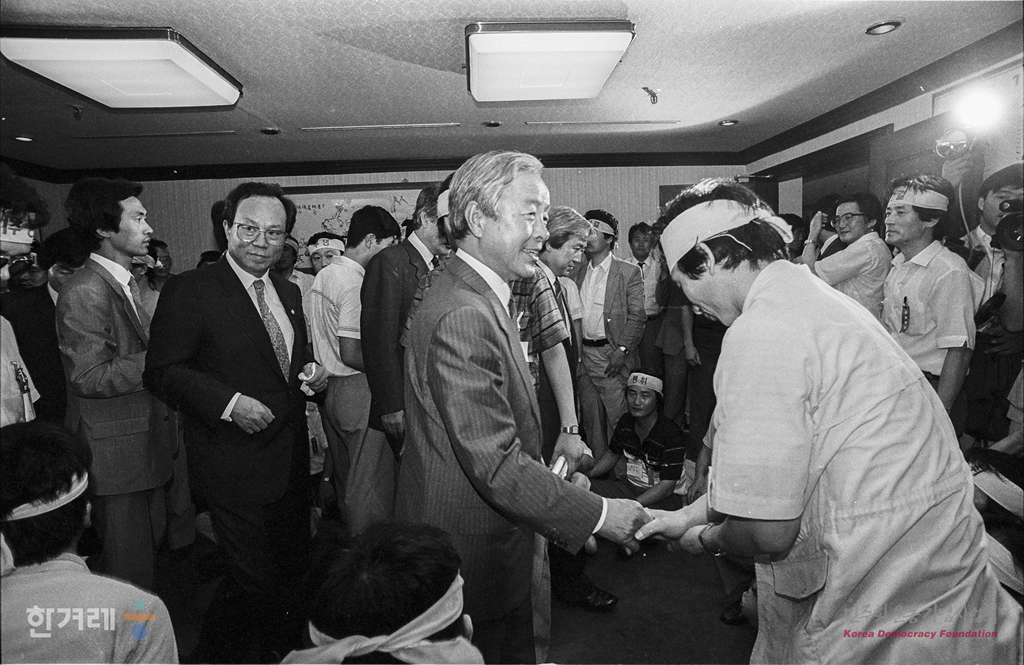 - 1988년 7월 13일 민주당 김영삼 총재는 부산 출신 의원들과 함께 부산일보사 파업 현장을 방문해 농성자들과 인사를 나누고 있다.