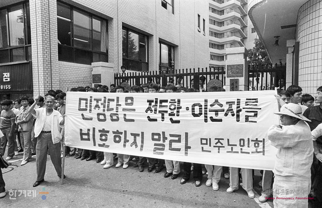 - 1988년 7월.28일 서울 종로구 종로3가 파고다공원 일대 노인 1백여명이 전두환 이순자씨 구속 수사와 윤길중 대표위원 면담 등을 요구하며 종로구 관훈동 민정당 중앙당사앞에서 농성을 벌이고 있다.