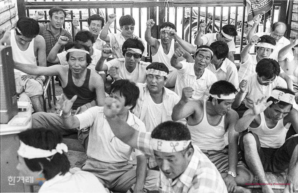 - 1988년 7월 31일 서울 노원구 중계동 통일택시(주) 조합원들이 회사앞에서 농성을 하고 있다. 이들은 전 조합장 채희만씨가 조합원도 모르는 사이에 쳬결한 단체협약의 수정을 요구하며 지난달 13일부터 농성에 들어갔다.