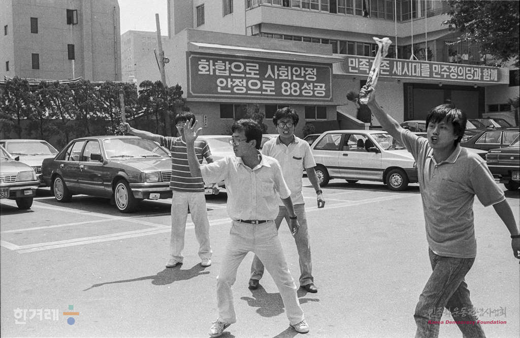 - 1988년 8월 3일. 고려대 구국결사대 5명이 종로구 관훈동 민정당 중앙당사 들어가 광주학살, 5공화국비리 원흉처단과 8.15 학생회담 보장을 요구하며 시위를 벌이려다 정문앞에서 경찰에 연행되고 있다.