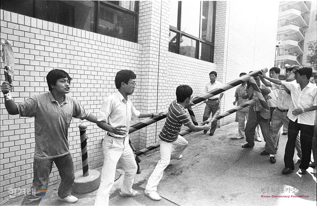 - 1988년 8월 3일. 고려대 구국결사대 5명이 종로구 관훈동 민정당 중앙당사 들어가 광주학살, 5공화국비리 원흉처단과 8.15 학생회담 보장을 요구하며 시위를 벌이려다 정문앞에서 경찰에 연행되고 있다.