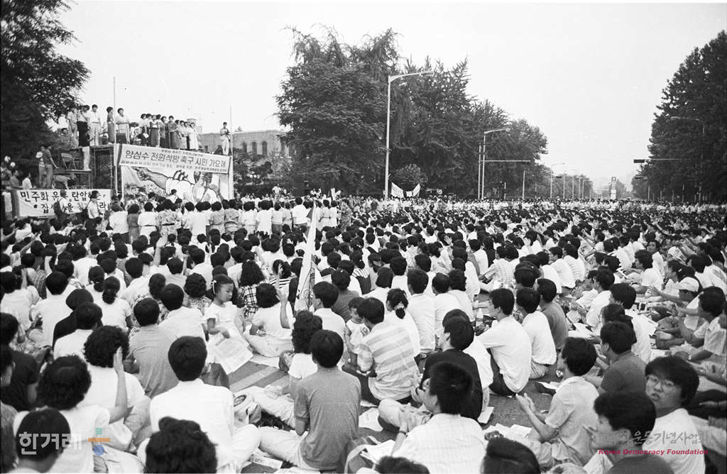 - 1988년 8월 6일 민주화실천기족운동협의회 주최로 서울 동숭동 대학로에서 시민 학생 구속자 가족 등 5천여명이 참석한 가운데 양심수 전원석방 촉구 시민가요제를 하고 있다.