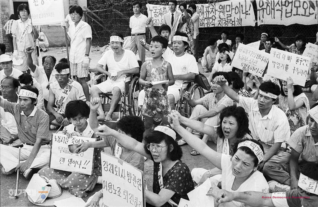 - 1988년 8월 7일 오후 6시 원진레이온 직업병환자, 가족, 재야단체회원등 70여명은 남양주군 미금읍 회사 정문 앞에서 ‘원진레이온 직업병관련 진상보고대회를 하고 있다.