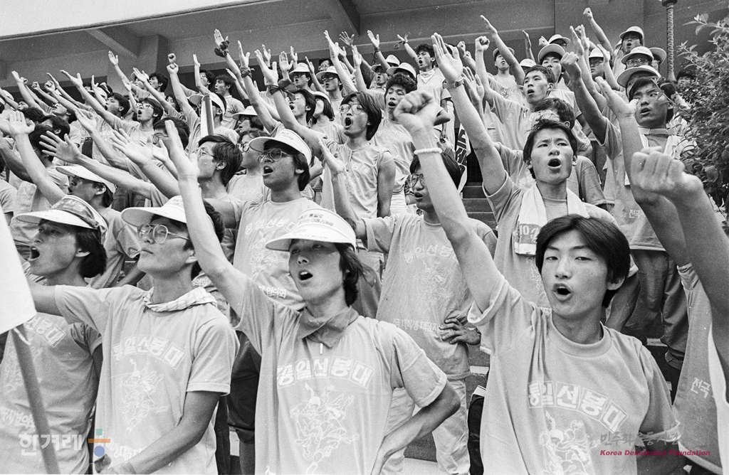 - 1988냔 8월 8일 오후4시 8.15 청년학생 실무회담과 국토순례대행진의 중심추진체인 전국대학생대표자협의회 통일선봉대 대원들이 서울 고려대 민주광장에서 통일선봉대 발대식을 하고 있다. 발대식에는 통일선봉대 전체 800명중에 경찰의 봉쇄로 인해 450명만 참석했다.