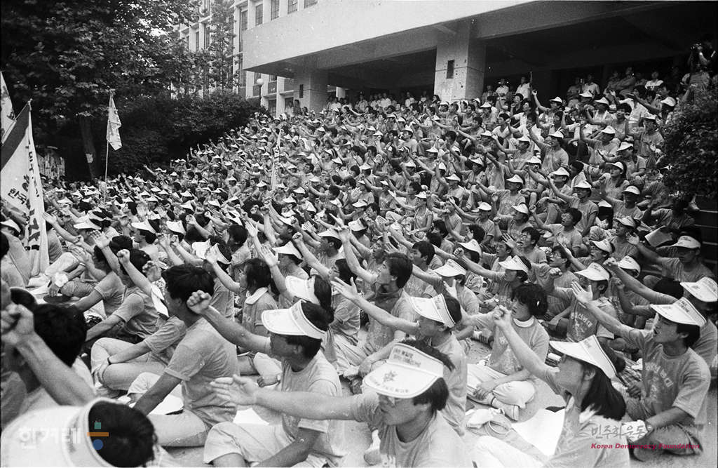 - 1988냔 8월 8일 오후4시 8.15 청년학생 실무회담과 국토순례대행진의 중심추진체인 전국대학생대표자협의회 통일선봉대 대원들이 서울 고려대 민주광장에서 통일선봉대 발대식을 하고 있다. 발대식에는 통일선봉대 전체 800명중에 경찰의 봉쇄로 인해 450명만 참석했다.