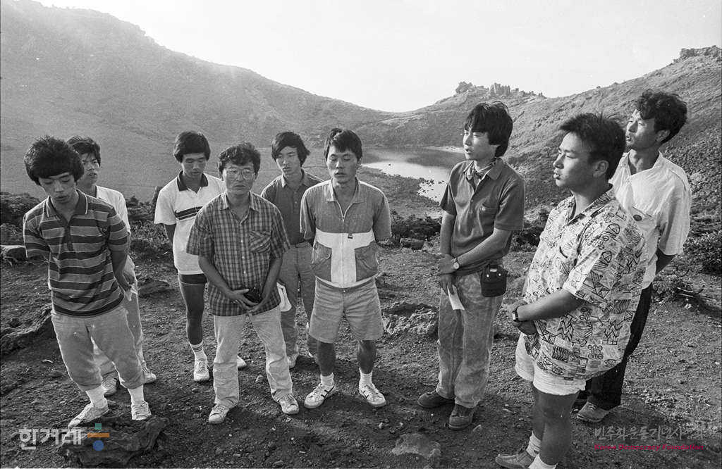 - 1988년 8월 9일. ’8.15 남북학생회담‘을 추진중인 전국대학생 대표자협의회 소속 대학생들이 제주도 한라산 정상 백록담에서 가질 에정이었던 국토순례대행진 출정식을 경찰의 강력한 봉쇄로 좌절된 가운데 오후6시 30분 백록담에 등산왔던 고려대생 윤석제씨등 10여명은 즉석에서 8.15 남북학생회담과 국토순례대행진의 정당성을 주장하는 성명설르 낭독하고 한라산의 흙과 백록담의 물을 채취하고 있다.