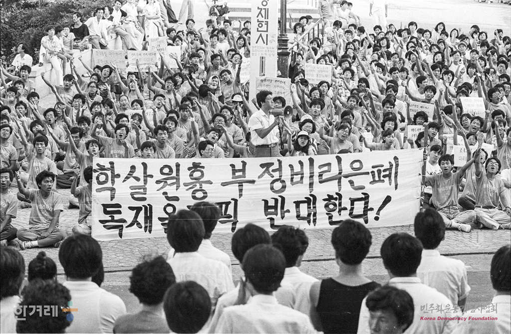 - 1988년 8월 12일 시민과 학생들이 ’정부의 국토순례 대행진과 8.15 남북학생회담‘ 개최장소를 비롯해 원천봉쇄와 지역에서 출발한 통일선봉대 연행 등 탄압에 대한 항의하며 서울 명동성당 입구에서 집회를 갖고 있다.