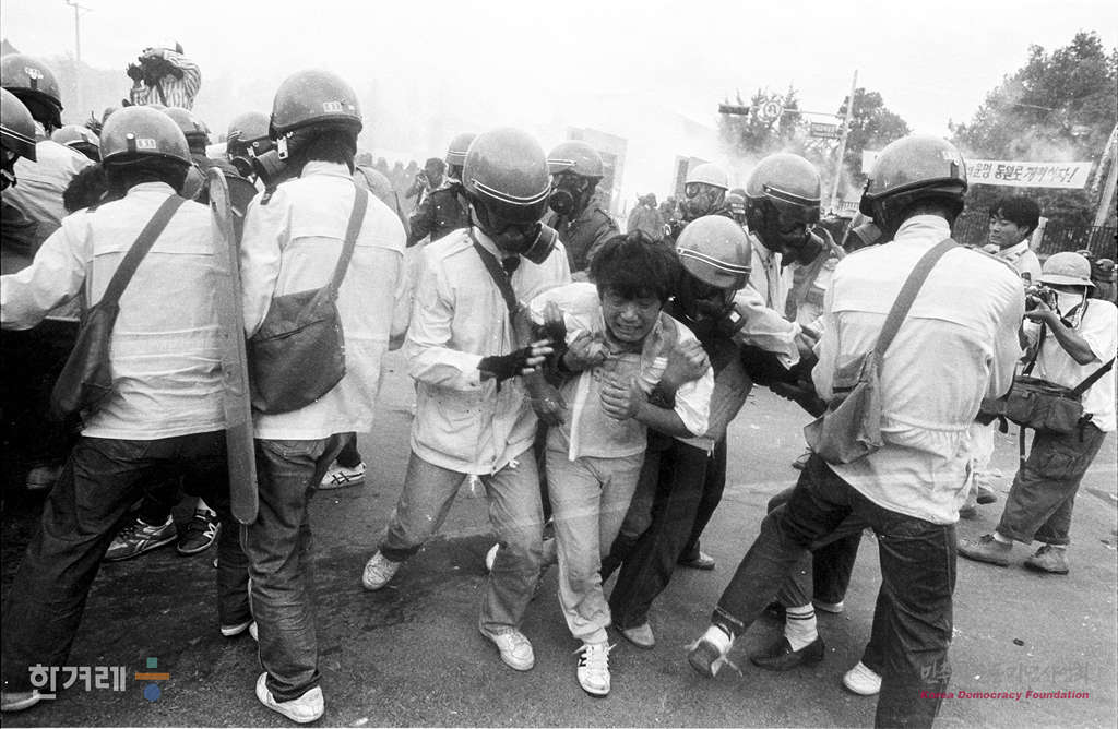 - 1988년 8월 14일 8.15학생회담을 하루앞둔 서울 연세대에서 학생들이 ’정부의 국토순례 대행진과 8.15 남북학생회담‘ 개최장소를 비롯해 원천봉쇄와 지역에서 출발한 통일선봉대 연행 등 탄압에 대한 항의하며 시위를 벌이다 경찰에 연행되고 있다.