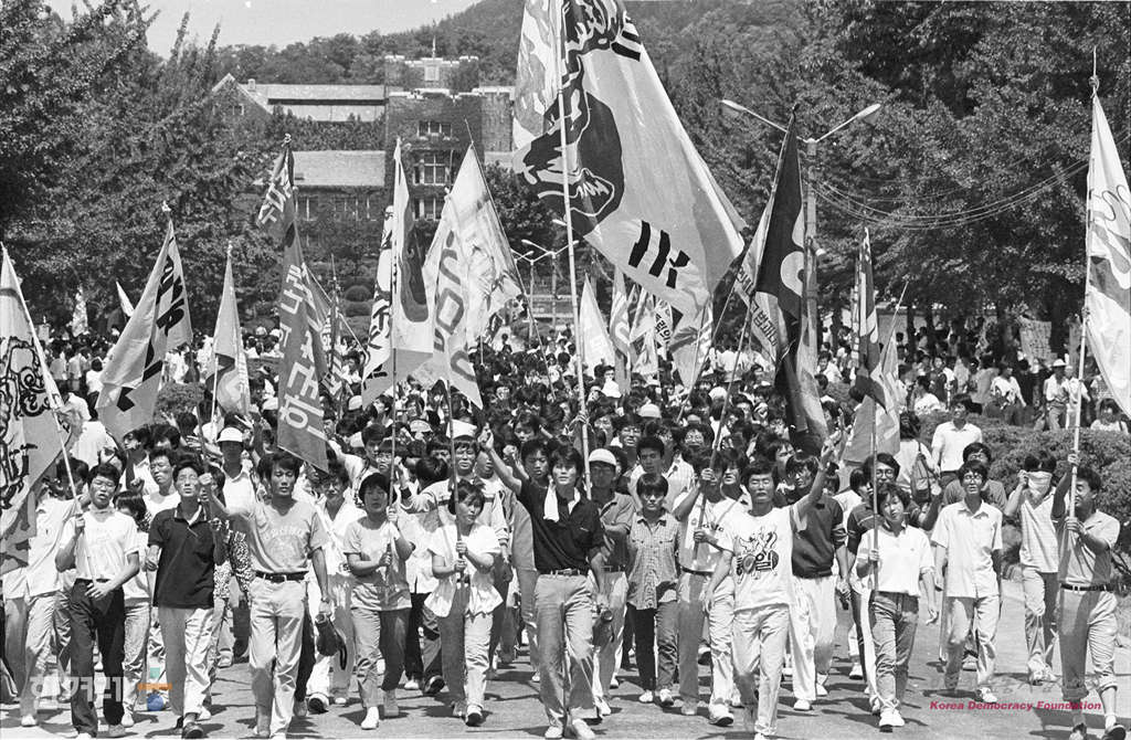 - 1988년 8월 14일 8.15학생회담을 하루앞둔 서울 연세대에서 학생들이 ’정부의 국토순례 대행진과 8.15 남북학생회담‘ 개최장소를 비롯해 원천봉쇄와 지역에서 출발한 통일선봉대 연행 등 탄압에 대한 항의하며 시위를 벌이고 있다.