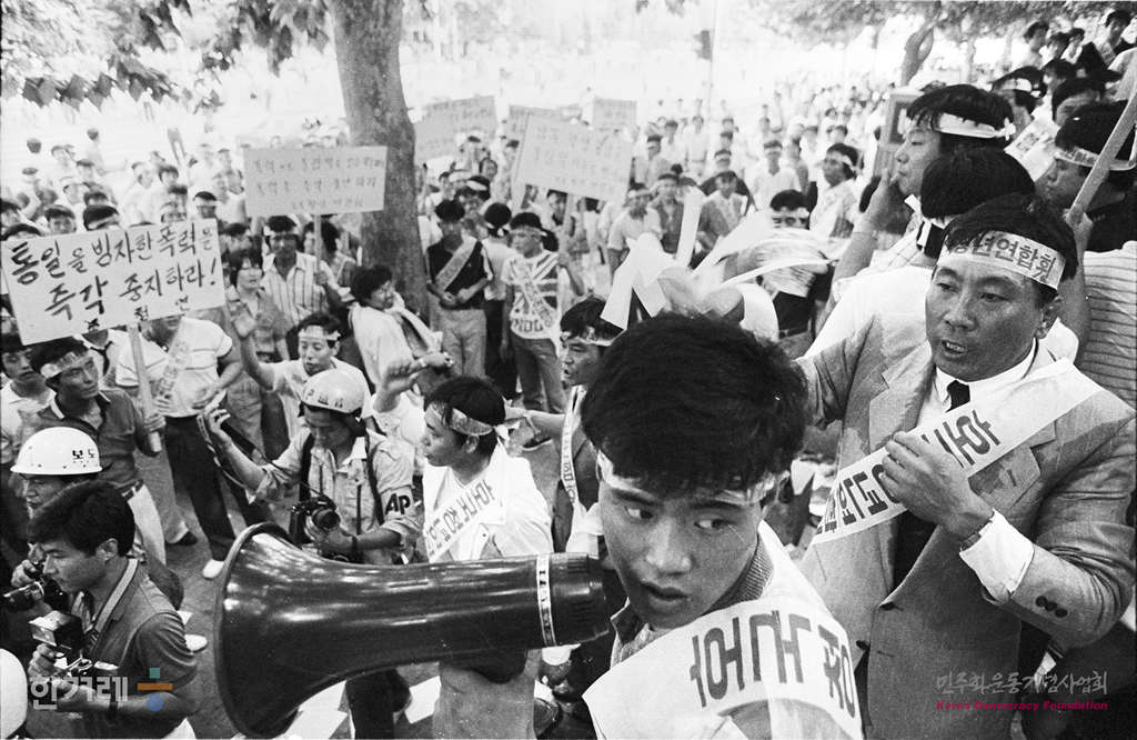 - 1988년 8월 14일 호국청년연합회 소속회원 5백여명은 시내에서 서울올림픽 성공적 개최를 위한 범국민궐기대회를 갖은 뒤 대학로로 몰려와 서울의대안에서 시위를 벌이던 전대협소속 대학생들과 담을 사이에 두고 실랑이를 벌이고 있다.
